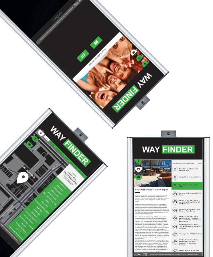 It also offers your guests a dynamic and easy way to engage with your location. Popular ways our clients have used our wayfinding software system to connect with their guests are through social media feeds, coupons and special deals, give aways and promotions, event calendars and location highlights, selfie stations, advertising and more.
